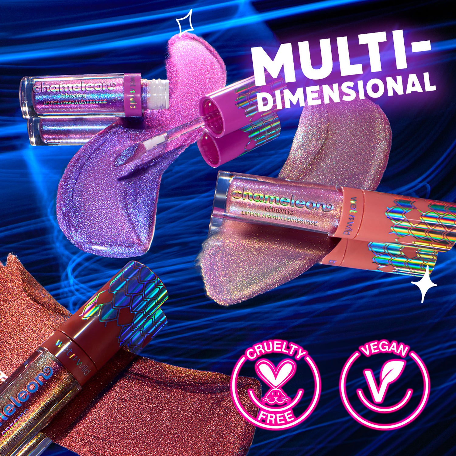 Own every version of yourself with Chameleon Chrome Lip Foil, a groundbreaking lip color that redefines what it means to shine! This isn’t just a lip color, it’s a statement as bold as you. With never-before-seen, light-reflecting pigments, each shade transforms with every shift in light, adapting and evolving to your surroundings. With a smooth, non-sticky formula in 2 mesmerizing shades, these lip foils provide full, multidimensional coverage that won’t budge.